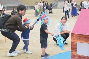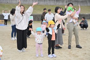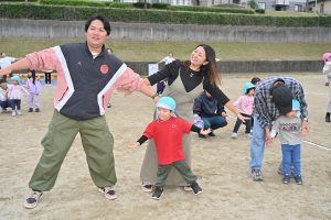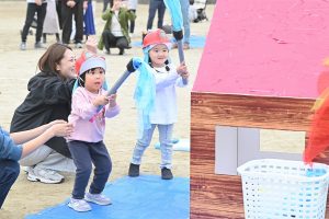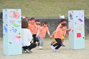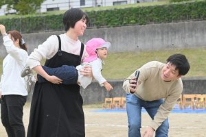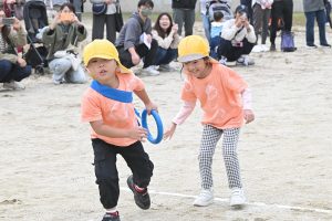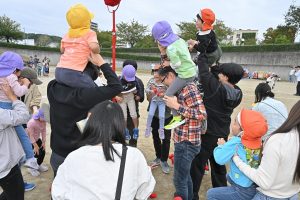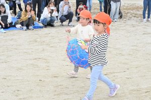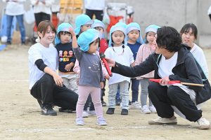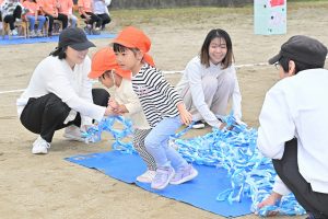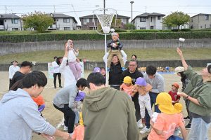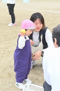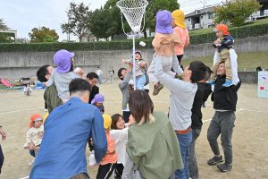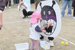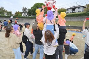 玉入れです。今年は卒園児・兄弟児対先生の部も。卒園児がたくさん参加してくれました💕