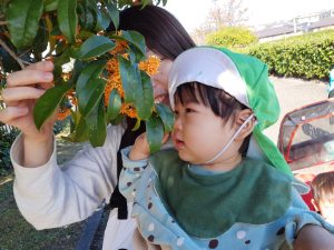 金木犀を見つけて保育者と一緒に匂いを嗅いだり、
