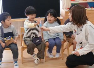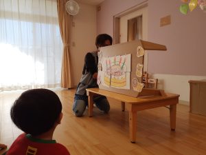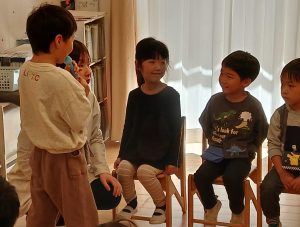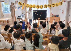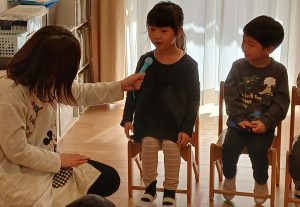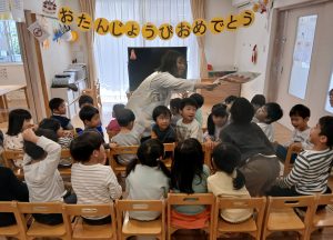 誕生日の子に指名してもらい、ちょっぴり照れたりしながらも「好きなお菓子は何ですか?」「好きな恐竜は何ですか?」等の質問をしてくれました。誕生日のお友だちが一生懸命考えながら質問にこたえる姿が印象的でしたよ♪