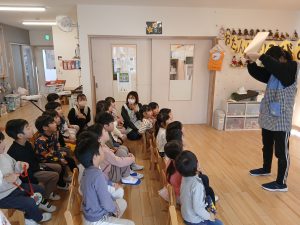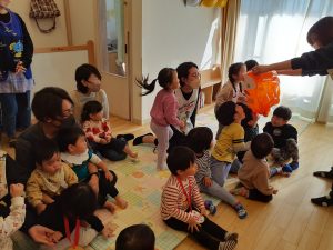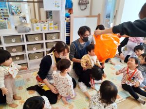 保育者からの出し物では、中身が変身する魔法のような不思議な袋が登場。