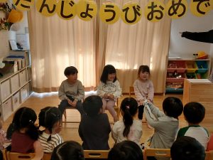 お誕生日のお友だちを皆で呼び込むと緊張してドキドキしながらも嬉し恥ずかしそうに前に出てきててくれました!
