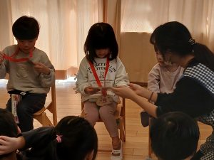 自分のお名前と何歳になるかをお話ししてくれました!お友だちからの質問では、好きな食べ物や好きな乗り物などを聞かれ、じっくり考えながら答えてくれましたよ!