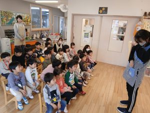 保育者からのプレゼントは、「みんなで一緒にケーキを作ろう!」のお話。