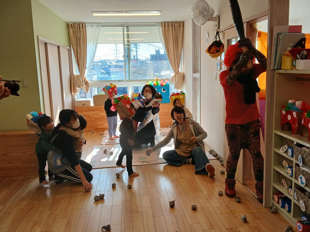 みんなで豆まきの練習をしていたところへ突然鬼が登場!