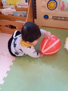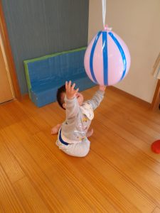 つかまり立ちのできるお友だちが膝をついて、ウーンと背伸びをして風船を触ろうとしていました。