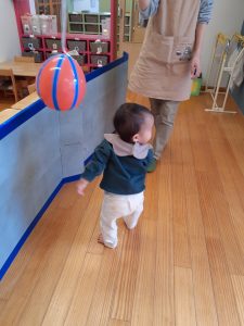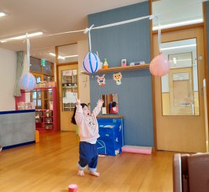 アンヨが上手になったお友だちは風船を持ち歩きながら、吊り下げられた風船にも手を伸ばしていました。