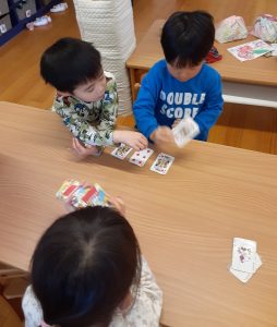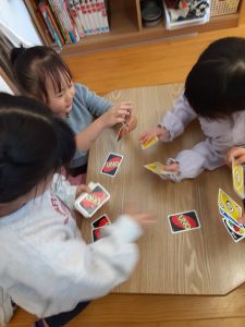 年長・年中チームさんは給食後のお部屋あそびで、トランプやウノなどのカードあそびが流行っています。