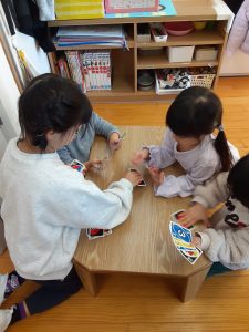 違うコーナーでは年中・年長さんが一緒にウノで遊んでいて、年長のお友だちがカードを配ったり、教えたりしていました。