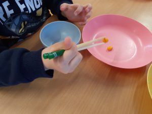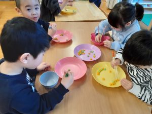 ポンポンを簡単に箸で掴めるお友だちはプラスチック製の豆を掴みます。