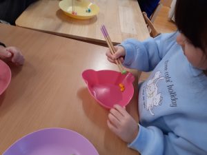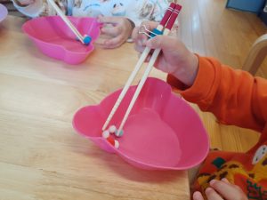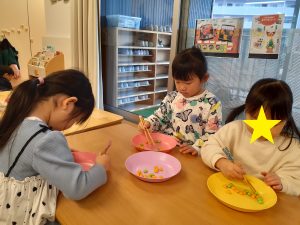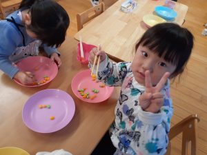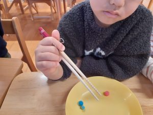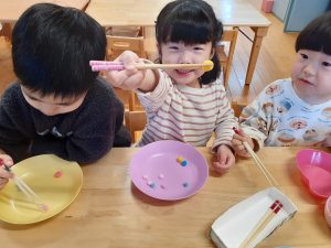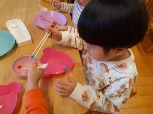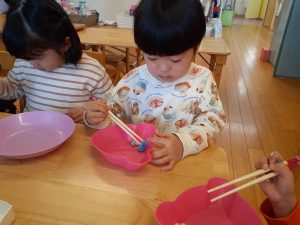 「何をしているのかな?」と見てみると箸の使用ができるようにと、箸を使って遊んでいました。
